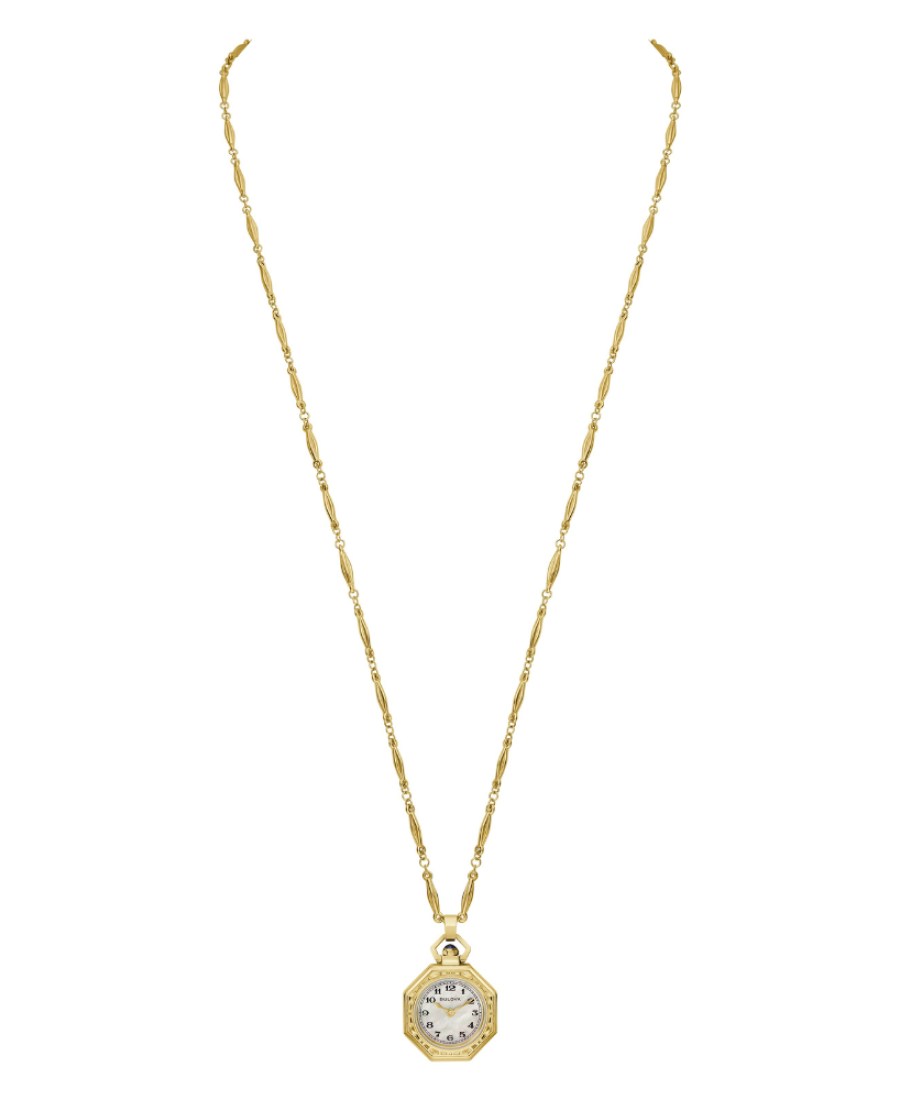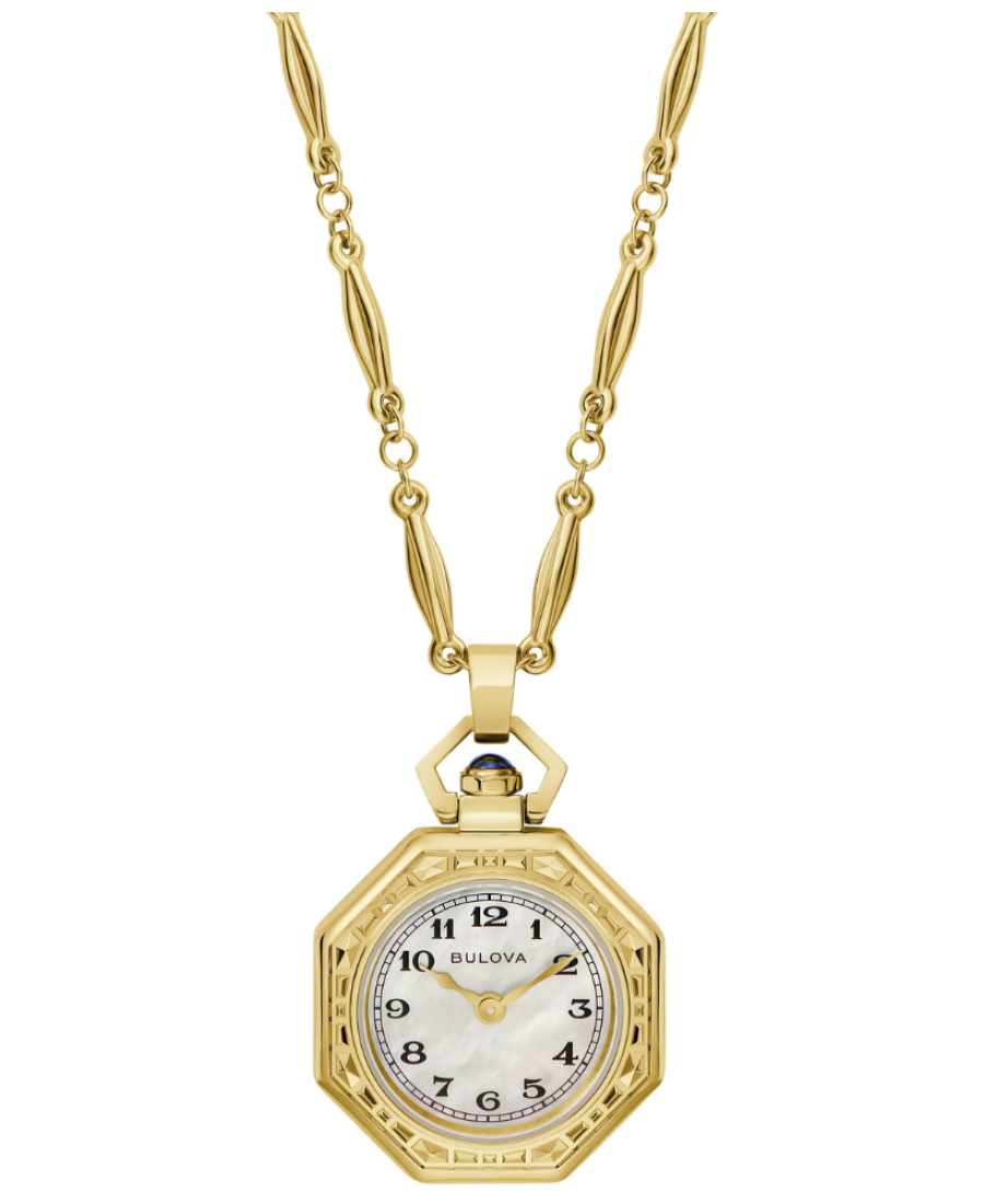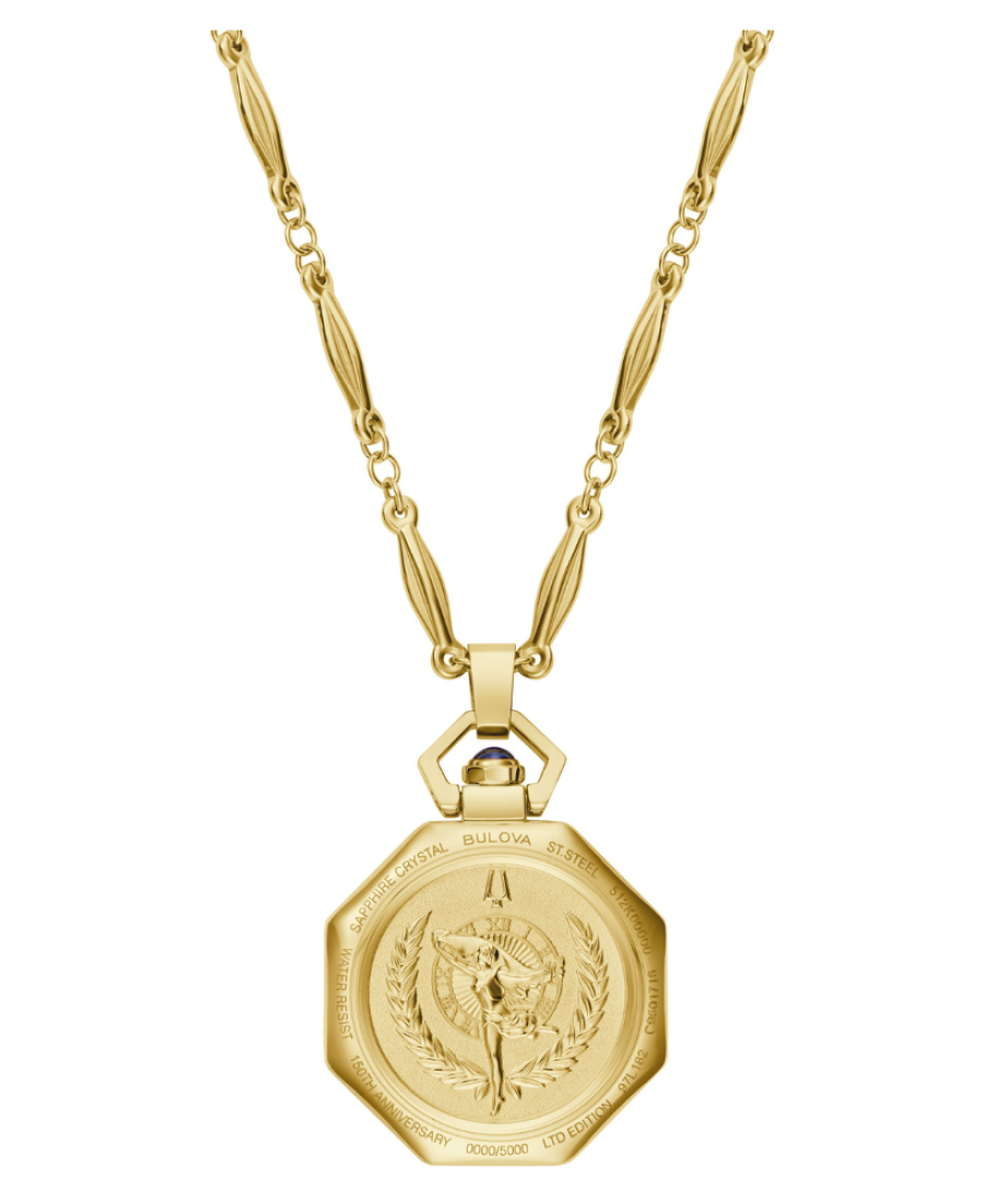 Con raíces en los relojes colgantes Rubaiyat de Bulova de principios del siglo XX, el nuevo reloj colgante Art Déco Rubaiyat de edición limitada captura la rica historia de Bulova en un diseño versátil para celebrar nuestro 150.º aniversario. Inspirado en un diseño Rubaiyat de 1919, este elegante reloj colgante cuenta con una caja octogonal pulida de acero inoxidable en tono dorado con un motivo de borde en relieve y un cabujón de espinela sintética azul en la corona de las 12. Brillante y sofisticada, la esfera de nácar presenta agujas de inspiración vintage y números arábigos impresos, mientras que el fondo de caja, numerado individualmente, exhibe una imagen en relieve de la Diosa del Tiempo.
