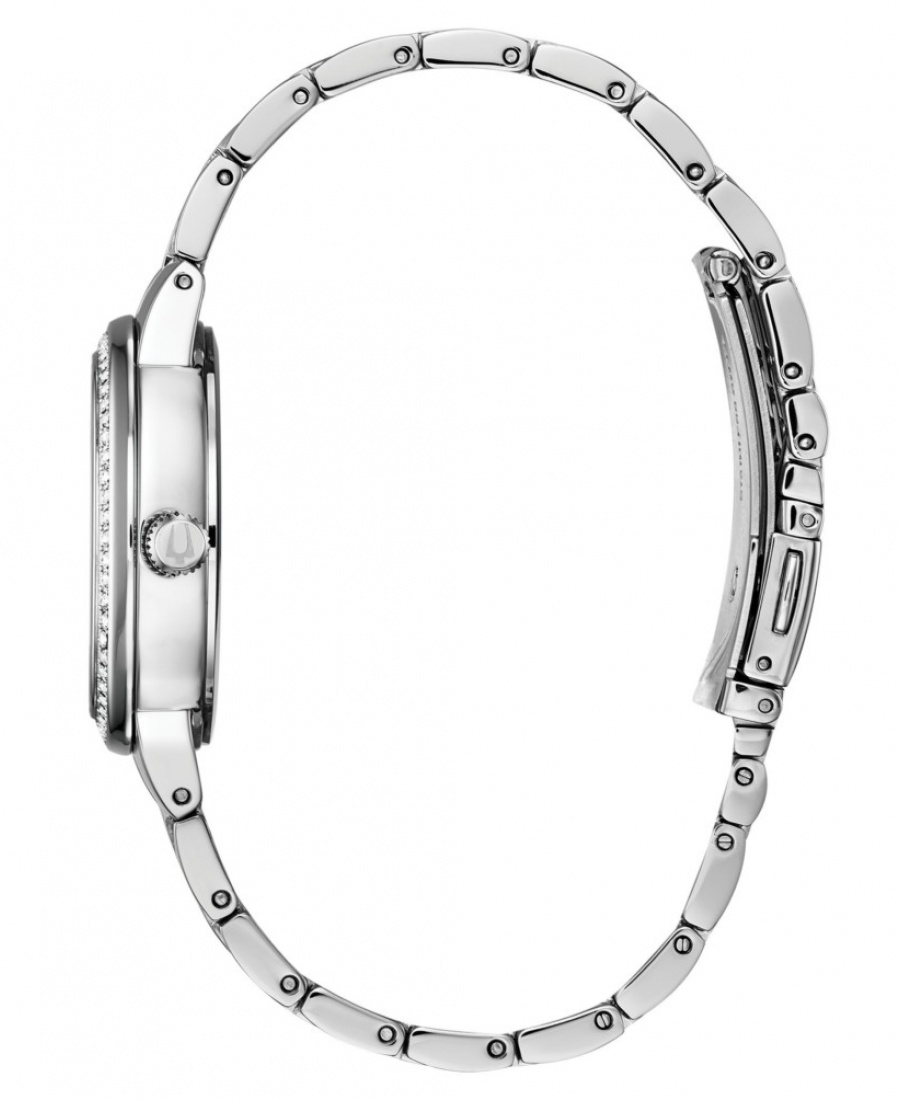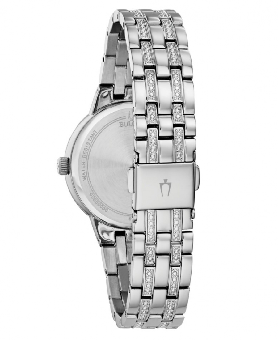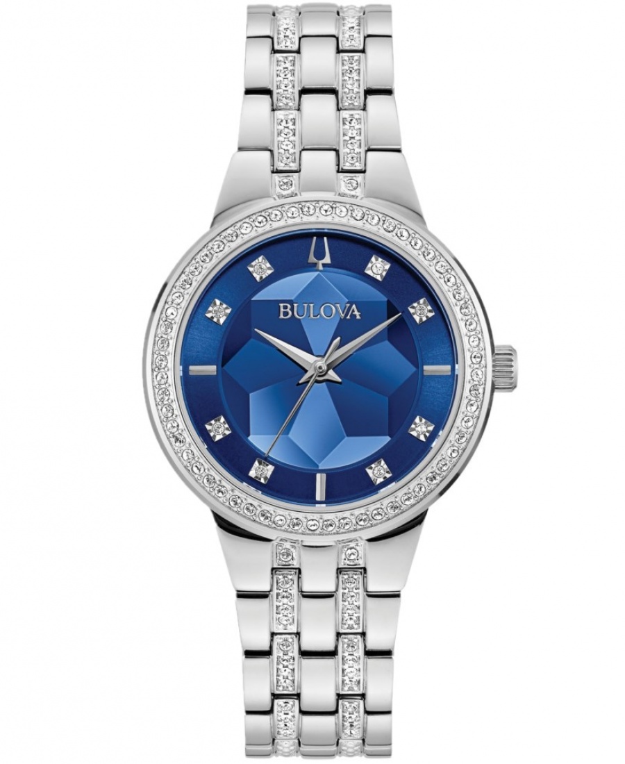 Caja de acero inoxidable con esfera de cristal mineral facetado azul para transmitir un aspecto tridimensional. Adornado con 120 cristales en la caja y el brazalete de acero inoxidable con una hebilla plegable corta con pulsadores, cristal mineral plano, resistente al agua hasta 30 metros.