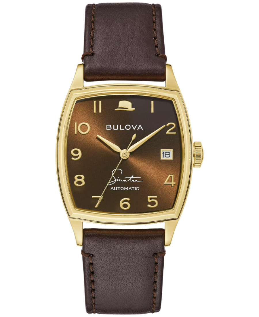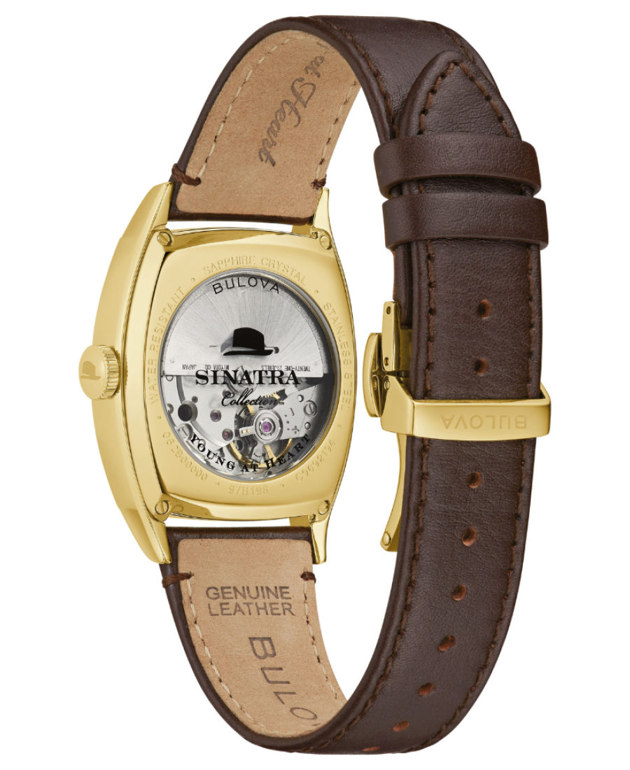 Incorporando diseños antiguos de Bulova con los elementos inconfundibles del legendario artista, Frank Sinatra, el reloj 'Young At Heart' presenta una caja de acero inoxidable en tono dorado con forma de tonel con manecillas y marcadores dorados. La firma de Frank Sinatra y el icónico sombrero Fedora se muestran en la esfera sunray color whisky intenso. El reloj cuenta con un movimiento automático Miyota Calibre 8215 de 21 joyas con una reserva de marcha de 42 horas y calendario.
