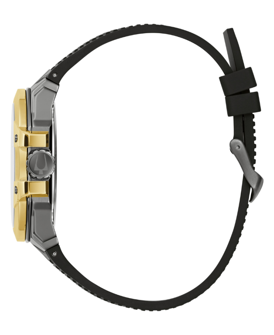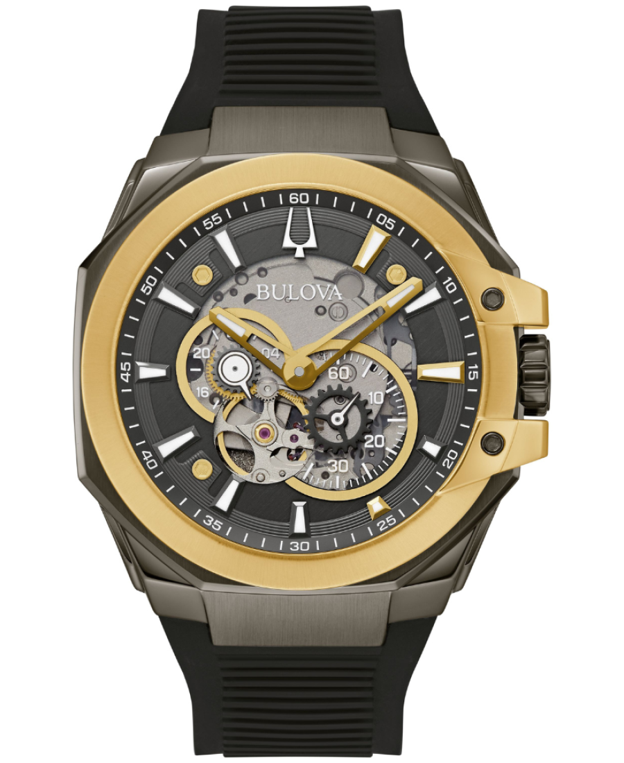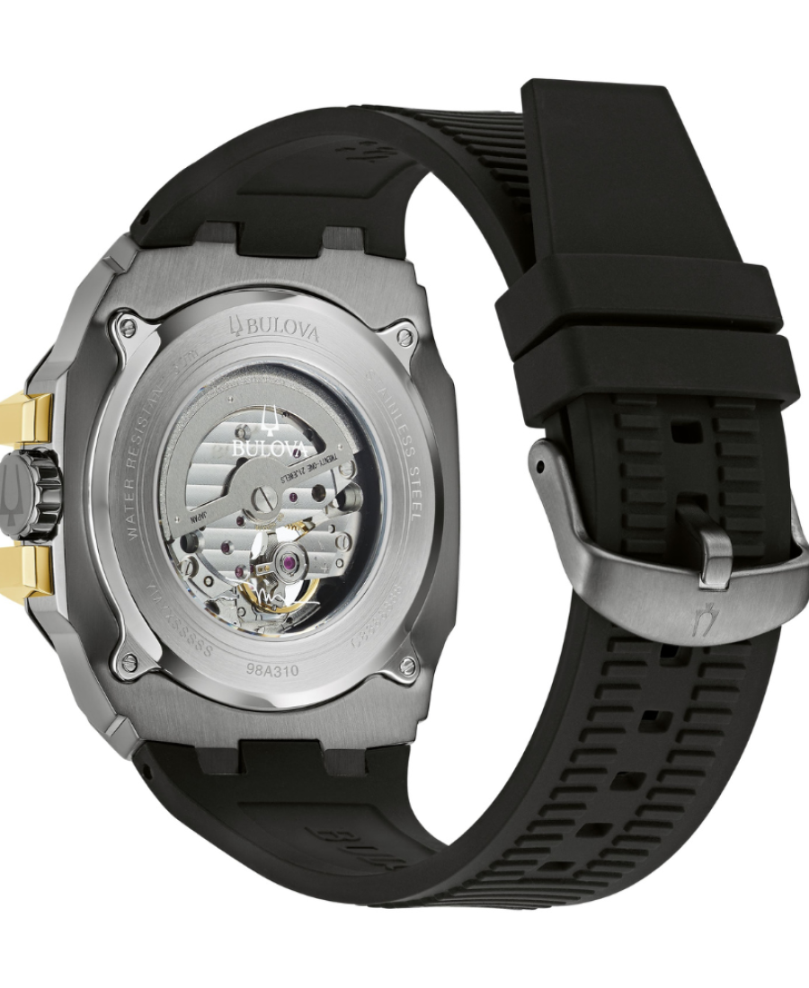Reloj Bulova colección Marc Anthony Máquina para Caballero. Movimiento mecánico de cuerda automática de 3 manecillas. Reserva de marcha de 42 horas. Caja realizada en acero inoxidable acabado PVD negro. Carátula negra esqueletada,detalles dorados en indicadores de 1,3 y 5hrs, manecillas e indicadores luminiscentes en negro.