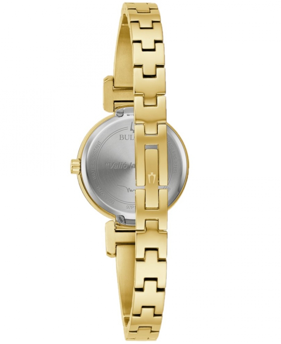 El nuevo reloj para mujer Bulova Marc Anthony Modern Bangle destaca el diseño atemporal de Bulova con un toque del estilo de Anthony. La caja de acero inoxidable en tono dorado reluciente presenta líneas contemporáneas audaces y tiene un cristal mineral metalizado que se extiende hasta el borde para una silueta perfecta. Una esfera de champán radiante está acentuada por tres marcadores de hora de diamantes a la 1, 3 y 5 en punto, números elegidos por Anthony por su significado personal.
