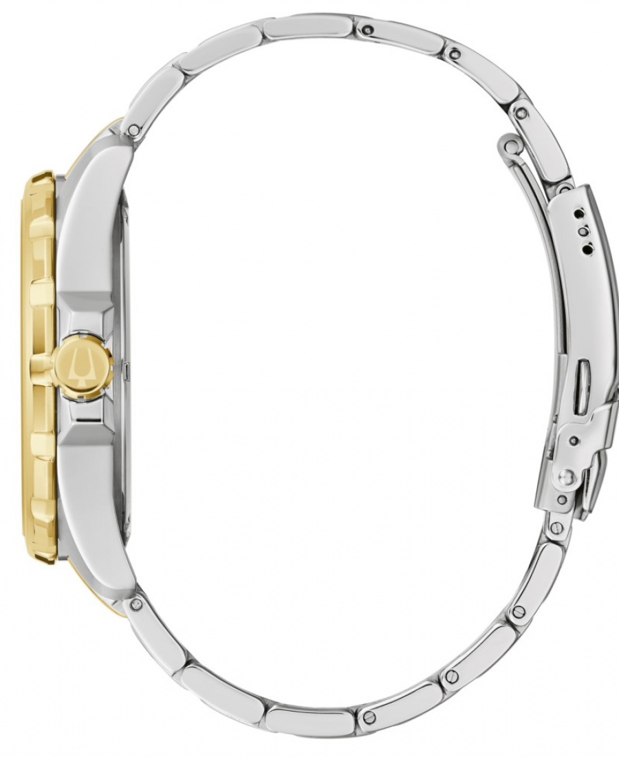 ACERO INOXIDABLE PORTY de la colección Marine Star, invoque alta mar con un estilo elevado con el nuevo reloj para hombre Marine Star. El diseño limpio y deportivo en acero inoxidable pulido en tono plateado con detalles en tono dorado presenta una esfera azul con rayos de sol con manecillas y marcadores luminosos y un calendario. Este reloj también tiene un cierre de hebilla plegable y es resistente al agua hasta 100 metros. Para un reloj Bulova que se destaca, el Marine Star es la elección perfecta.