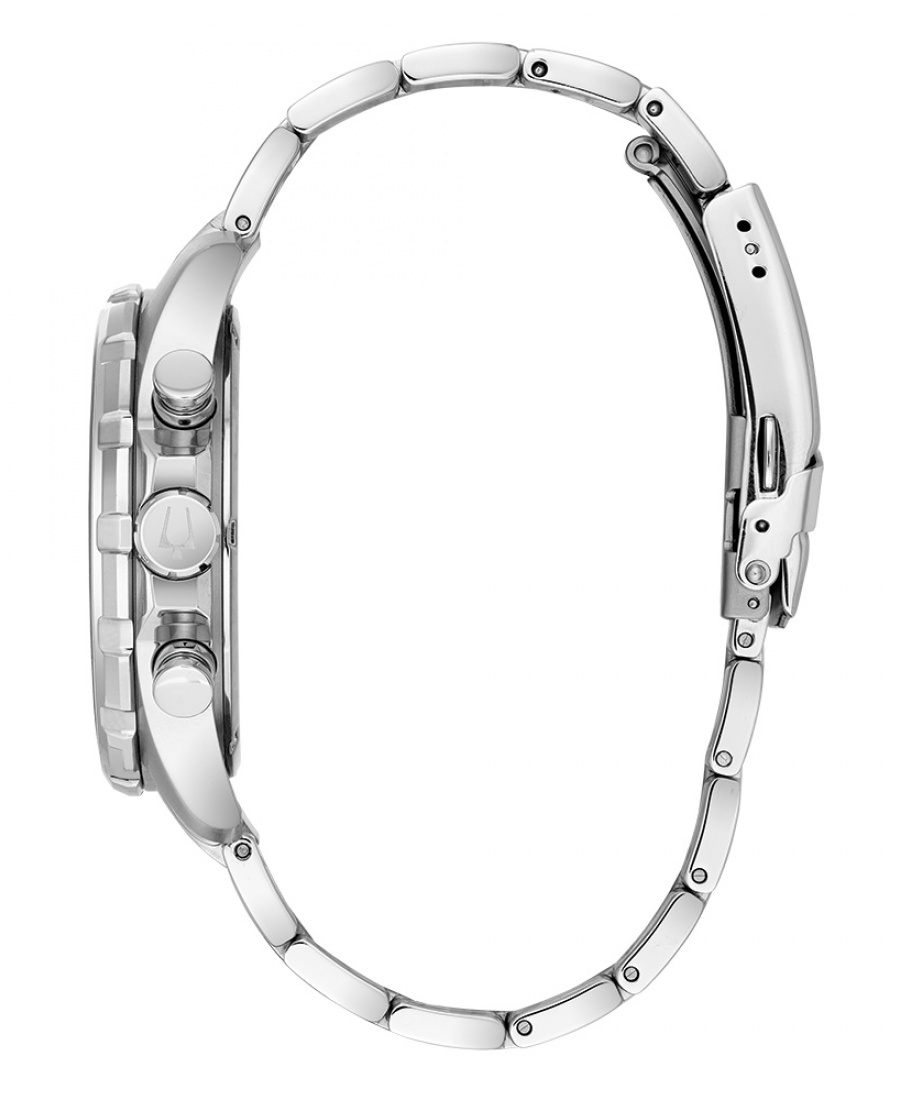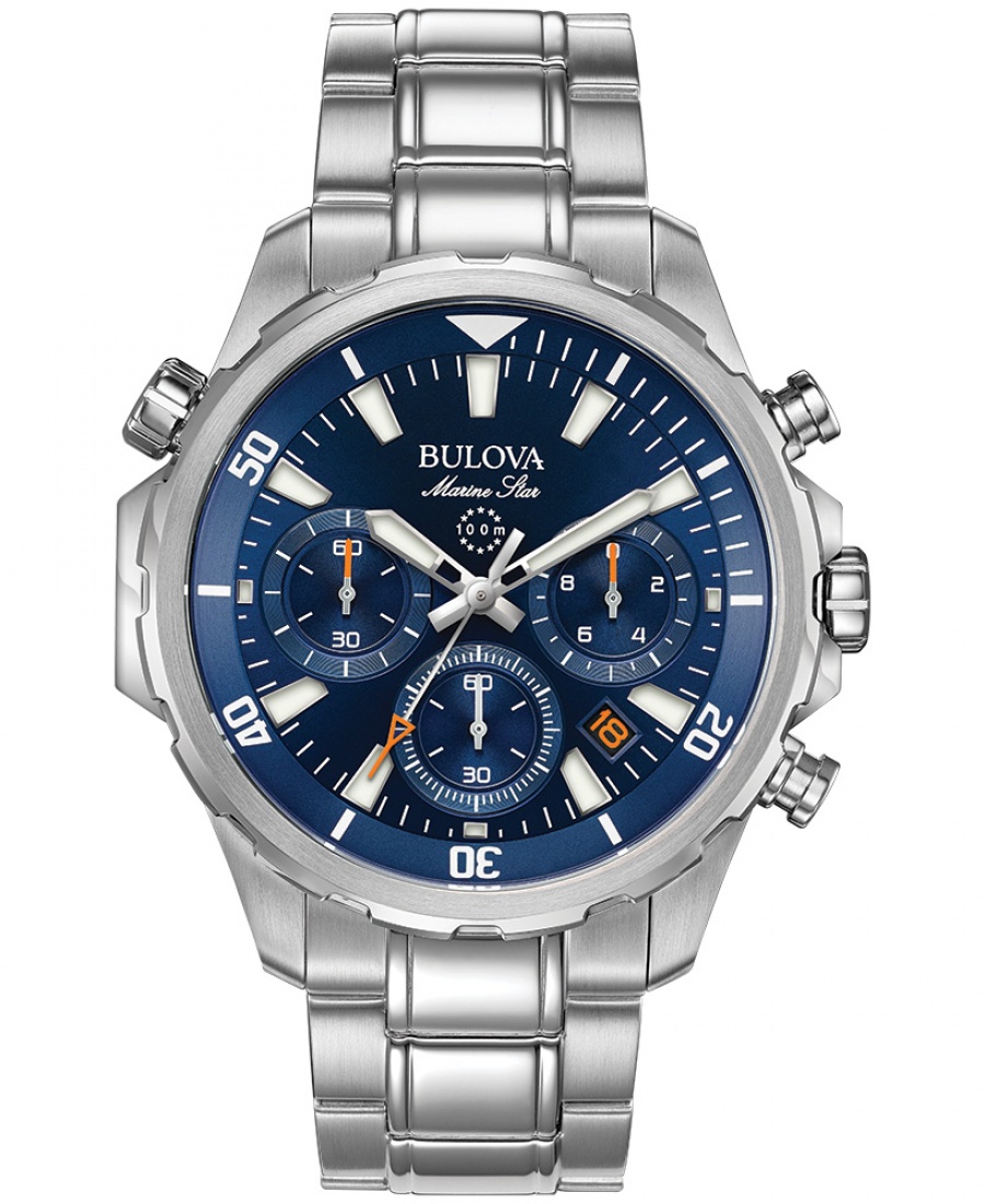De la colección Marine Star. Cronógrafo calendario de seis manecillas en acero inoxidable con acabado plateado y esfera azul, cristal mineral plano, caja atornillada y cierre plegable con pulsadores, barra de seguridad y extensor.