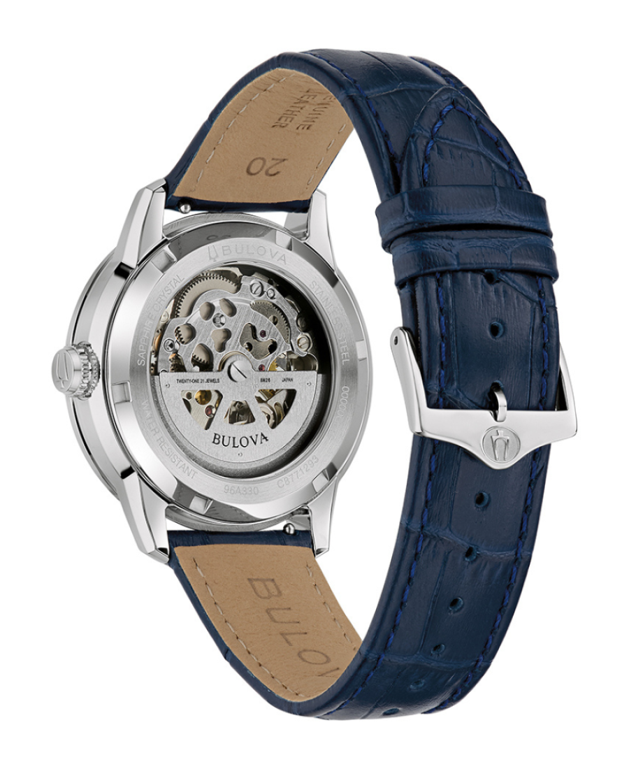 Reloj Bulova para Caballero, colección Sutton. Movimiento mecánico de cuerda automática de 3 manecillas. 42 horas de reserva de marcha. Caja realizada en acero inoxidable. Carátula esqueletada que permite observar el funcionamiento del reloj en gris, indicadores y manecillas luminiscentes en azul.
