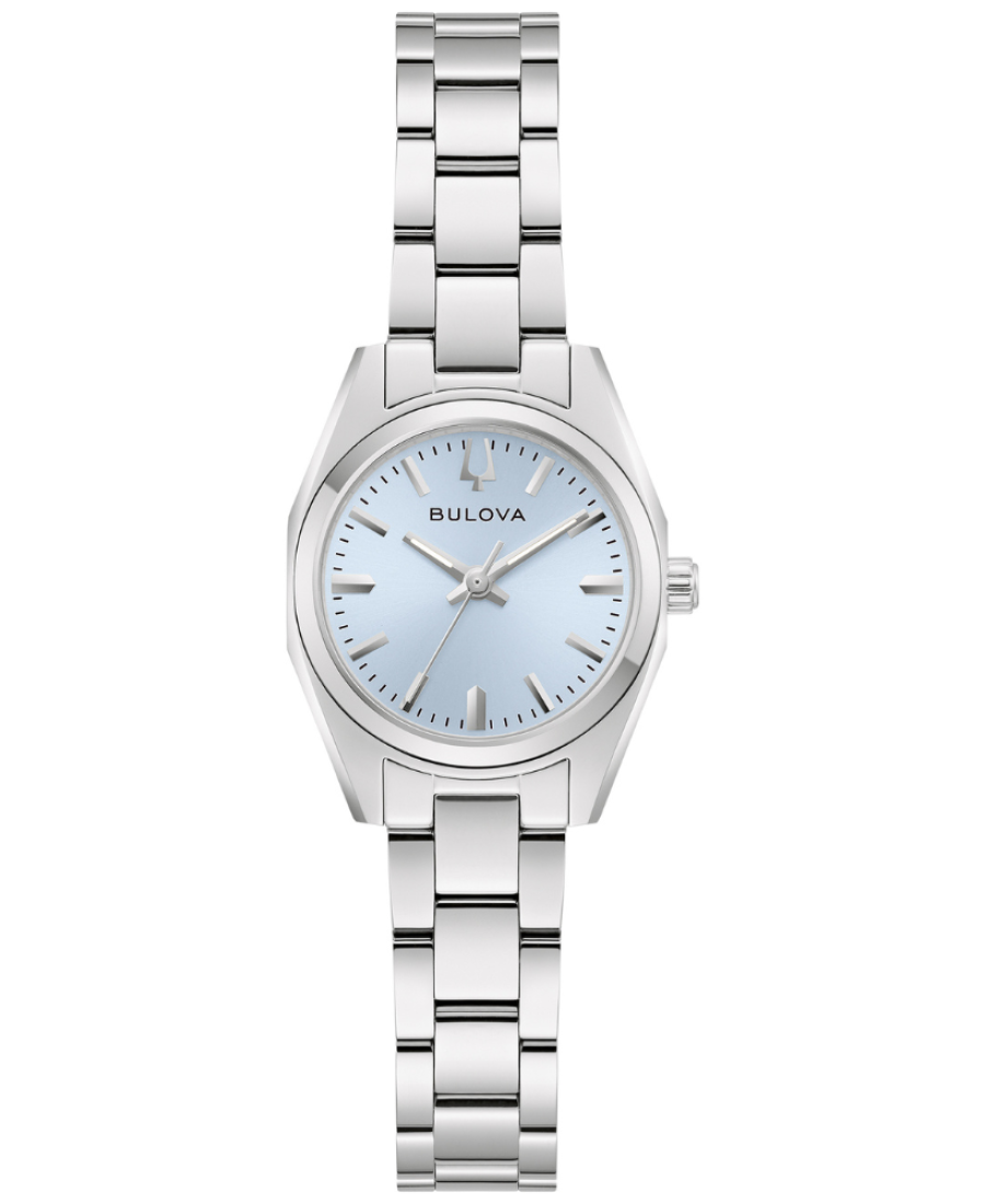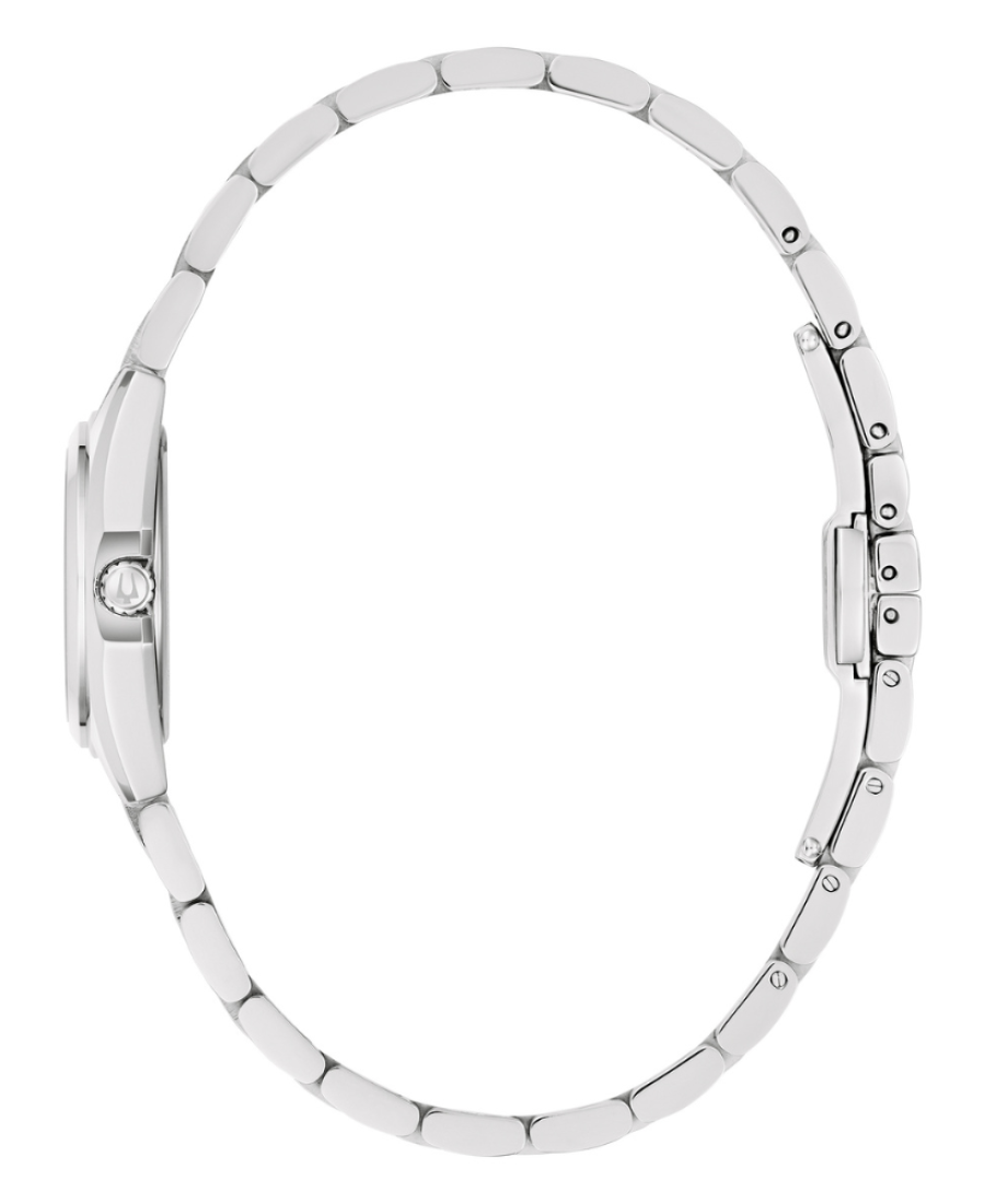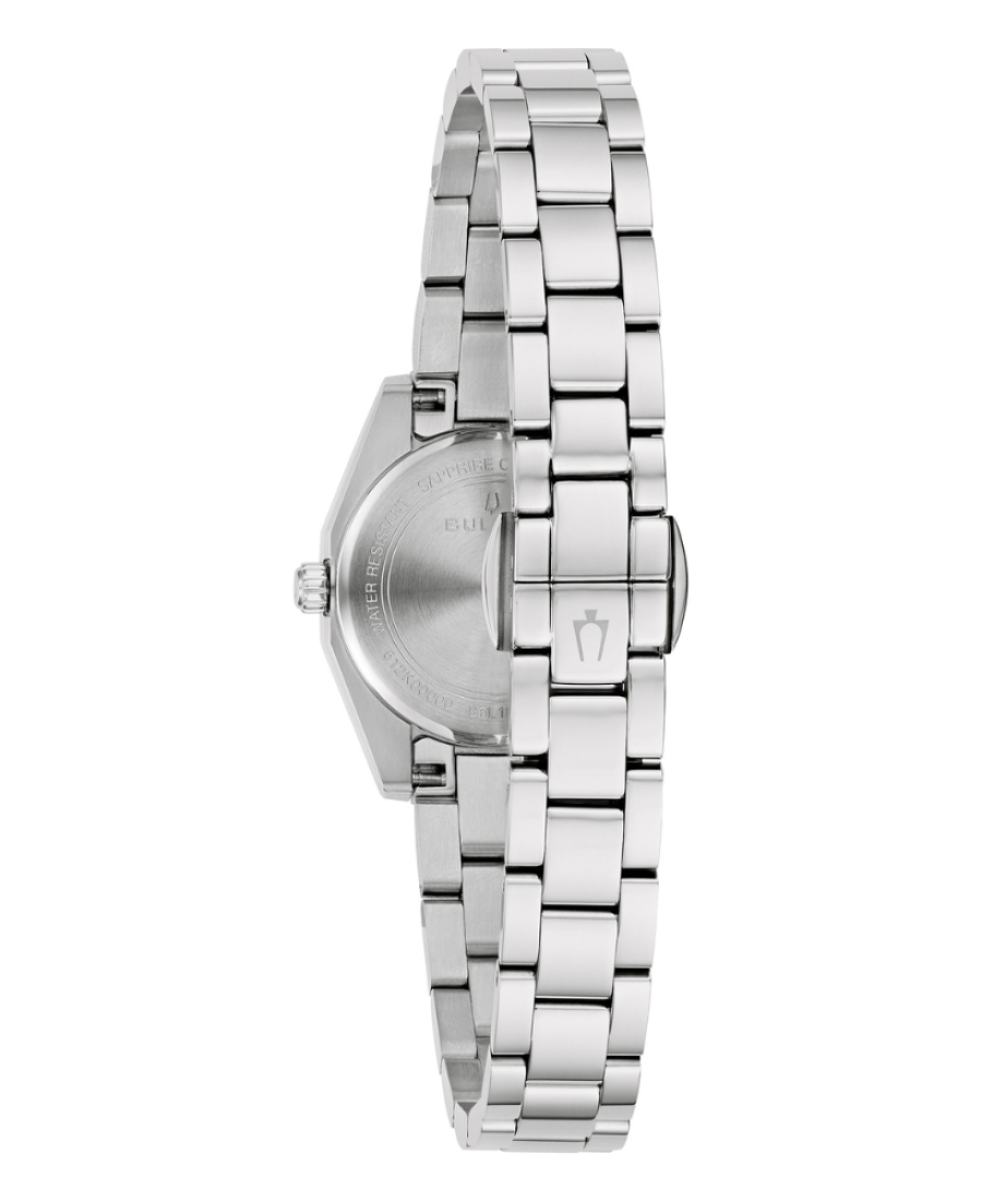 Definido por su excepcional calidad y estética sofisticada, el Surveyor de Bulova para mujer es el reloj moderno por excelencia, actualizado con una mini caja de 23 mm. Los bordes esculpidos y el facetado distinguen la caja de acero inoxidable plateado pulido, con acabado pulido y cepillado, un cristal de zafiro plano y un brazalete de acero inoxidable plateado de tres eslabones a juego con cierre desplegable de botón y pasadores de fácil liberación.