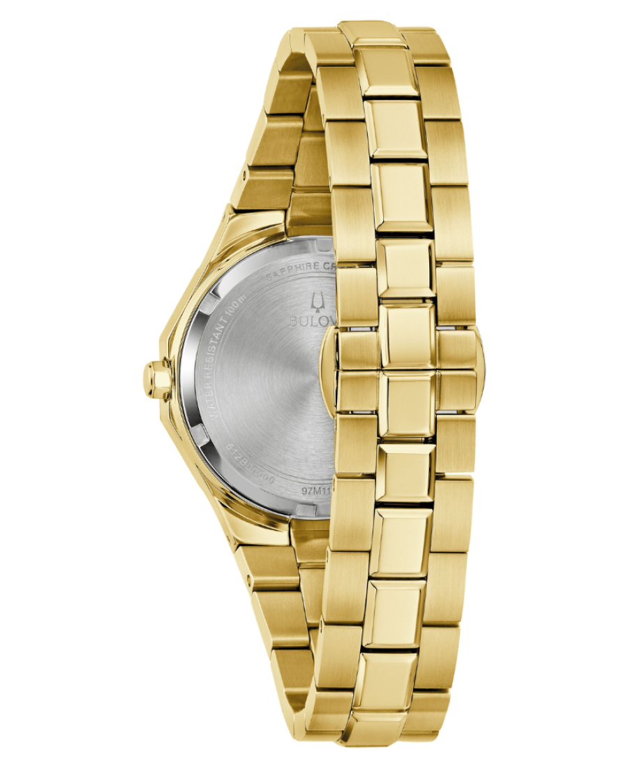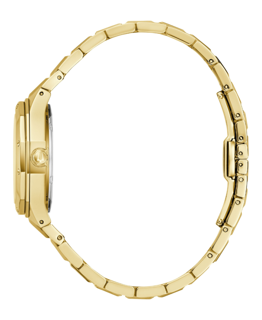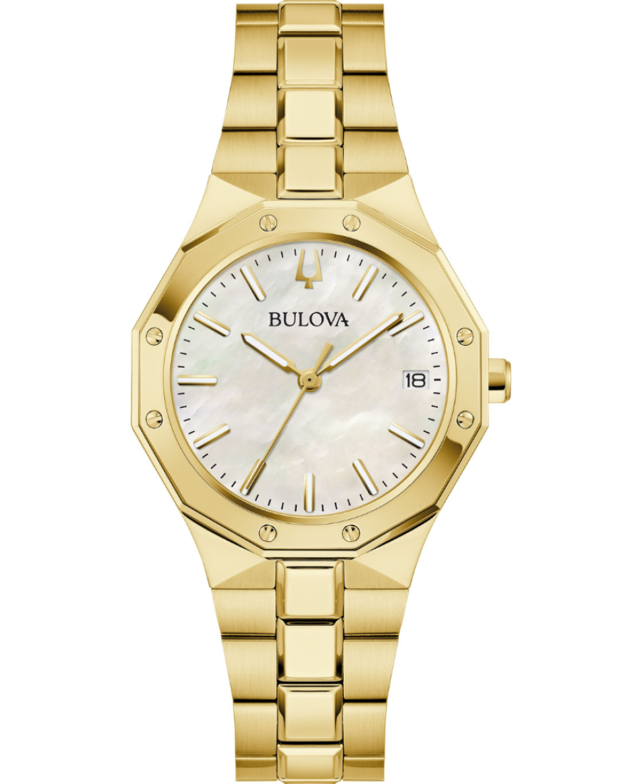 Este reloj clásico de Bulova Prestige para mujer se caracteriza por su diseño audaz y sofisticado, que combina un diseño audaz con una presencia elegante. El reloj cuenta con una caja de acero inoxidable facetada de 32 mm en tono dorado con bisel geométrico, cristal de zafiro plano con revestimiento antirreflejos, resistencia al agua de 100 m y una pulsera de 3 eslabones biselados con acabados cepillados y pulidos y un cierre desplegable con pulsador. La esfera de nácar brillante tiene agujas y marcadores aplicados en tono dorado con relleno luminiscente Super-LumiNova y una pantalla de fecha.