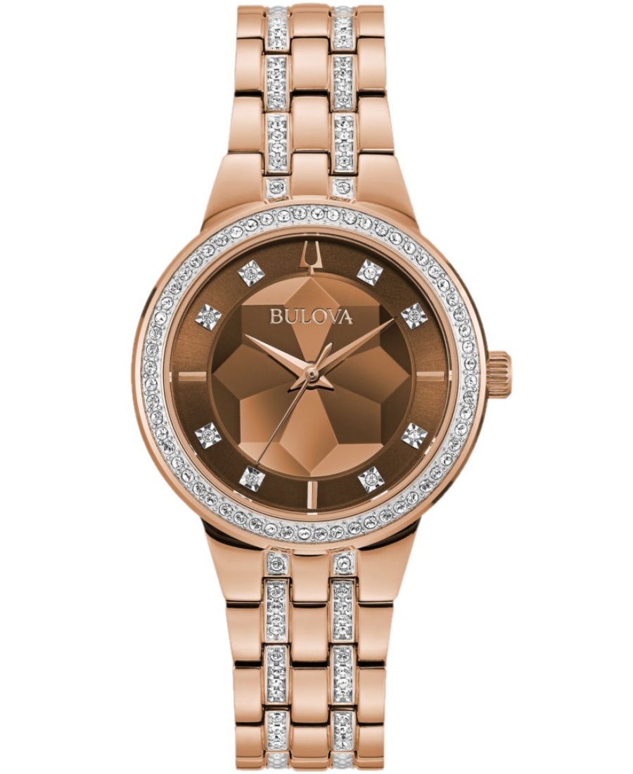 Caja de acero inoxidable en tono oro rosa con esfera de cristal mineral facetado en tono oro rosa para transmitir un aspecto tridimensional. Adornado con 120 cristales en la caja y el brazalete de acero inoxidable en tono oro rosa con una hebilla plegable corta con pulsadores, cristal mineral plano, resistente al agua hasta 30 metros.