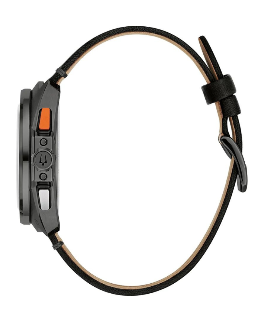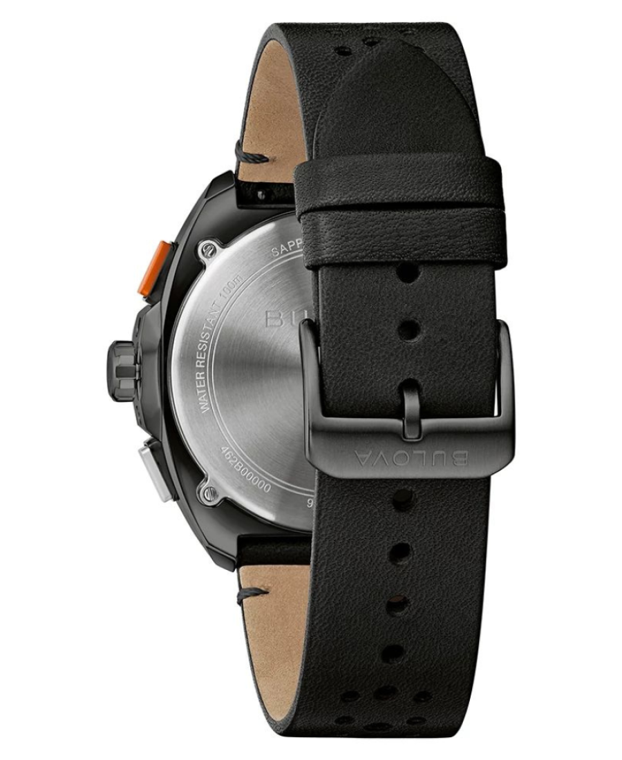 Reloj Bulova colección Racer para Caballero. Movimiento cronógrafo de cuarzo de 5 manecillas y fechador en posición de las 6Hrs.Caja realizada en acero inoxidable acabado PVD negro que asemeja las curvas aerodinámicas de los autos más veloces del mundo. Función de taquímetro en dos tonos negro/naranja. Carátula negra, indicadores y manecillas luminiscentes, detalle naranja en segundero. Correa de piel negra microperforada estilo Racer, con broche tipo hebilla de 3 piezas.