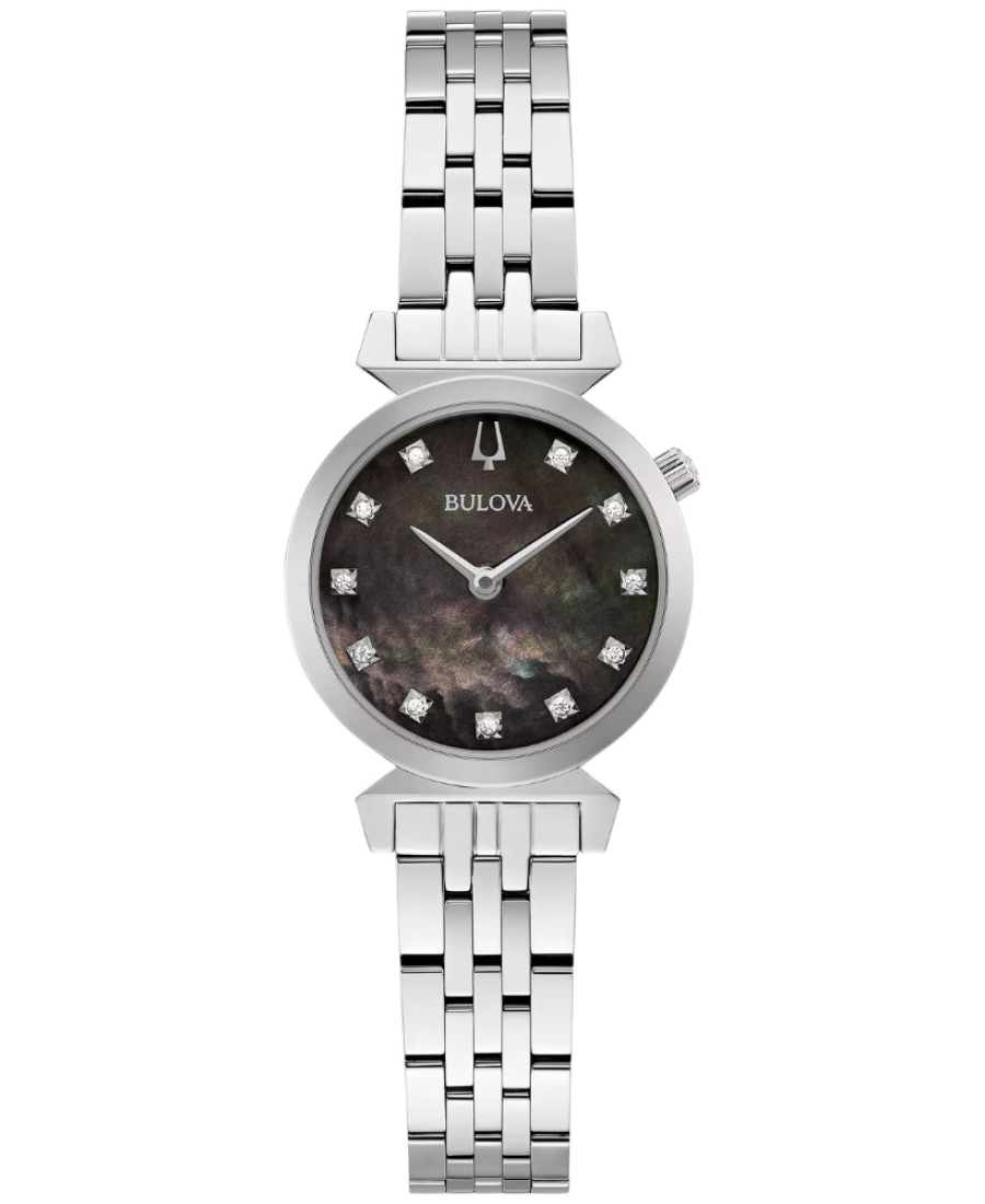 Inspirado en los relojes clásicos de Bulova, el pequeño Regatta de acero inoxidable presenta una esfera de nácar negra brillante engastada con 11 diamantes. Los detalles de diseño exclusivos de Regatta incluyen la corona en la posición de las 2 en punto y asas en ángulo distintivas. Cristal de zafiro plano, movimiento de cuarzo delgado y resistencia al agua hasta 30 metros.