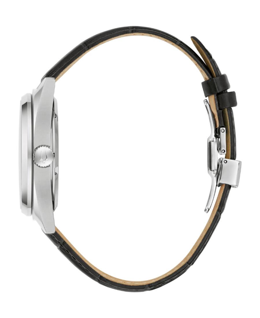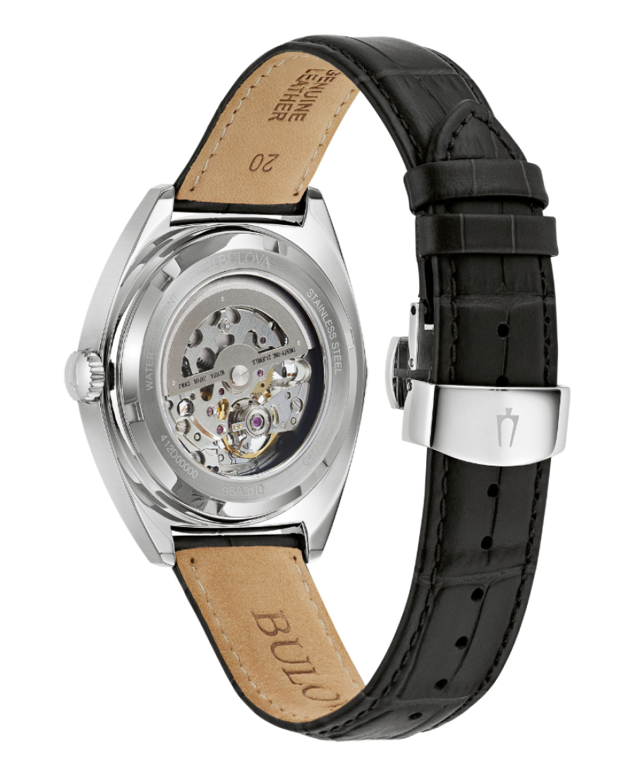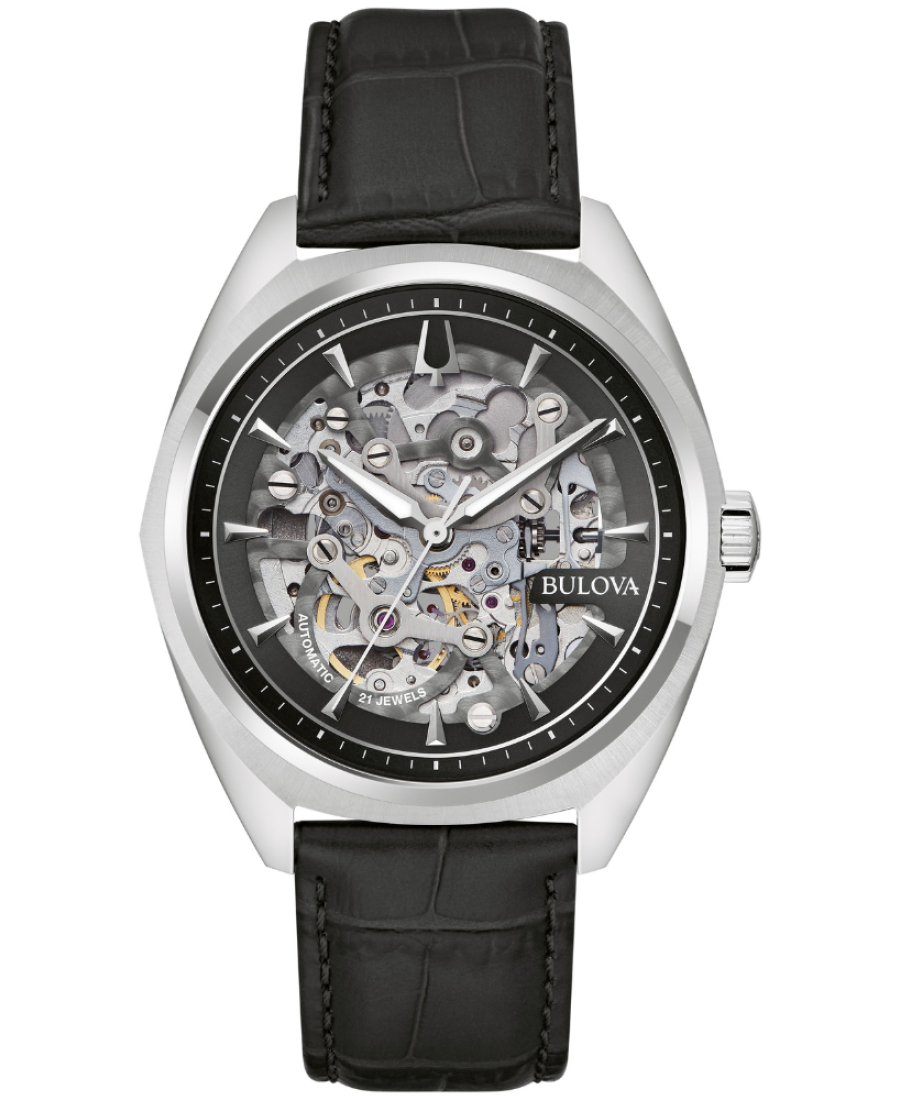 Este nuevo reloj automático para hombre de la colección Surveyor de Bulova ofrece un estilo moderno y una artesanía lujosa a un precio excepcional. La caja de acero inoxidable en tono plateado contemporáneo transmite una llamativa combinación de superficies cepilladas y pulidas con una angularidad sutil y un cristal mineral abovedado. La notable esfera se destaca por la visualización del movimiento automático esqueletizado de 21 joyas, que cuenta con una reserva de marcha de 42 horas. Alrededor de la esfera hay un anillo de capítulo negro con índices de hora aplicados, que se complementa con agujas angulares con relleno luminiscente.