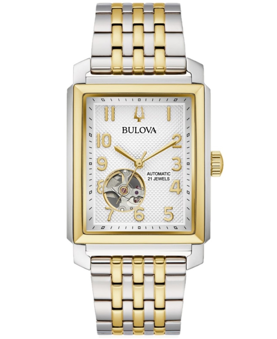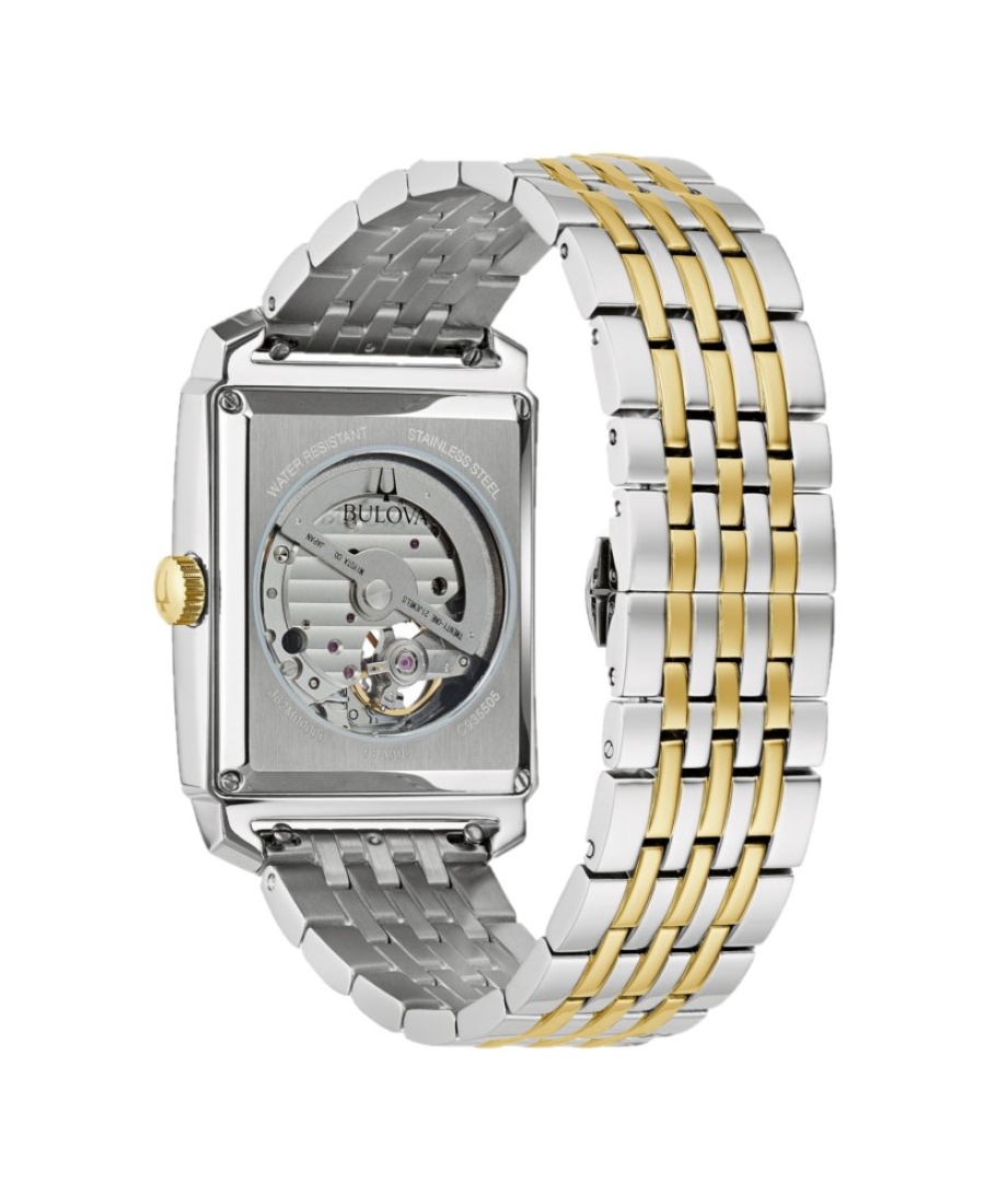 Reloj Bulova colección Sutton para Caballero. Movimiento mecánico de cuerda automática de 3 manecillas con reserva de marcha de 42 horas. Caja rectangular y brazalete realizados en acero inoxidable dos tonos acero/dorado, broche desplegable de doble pulsador.