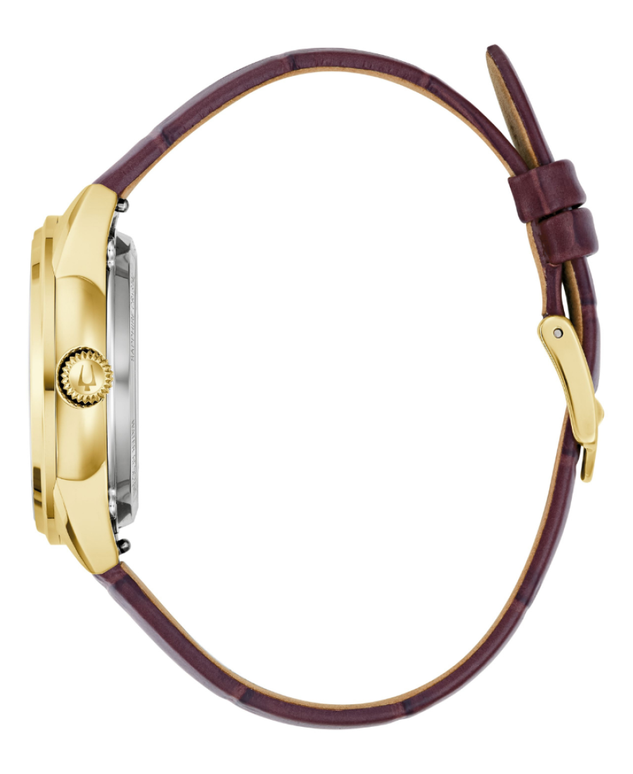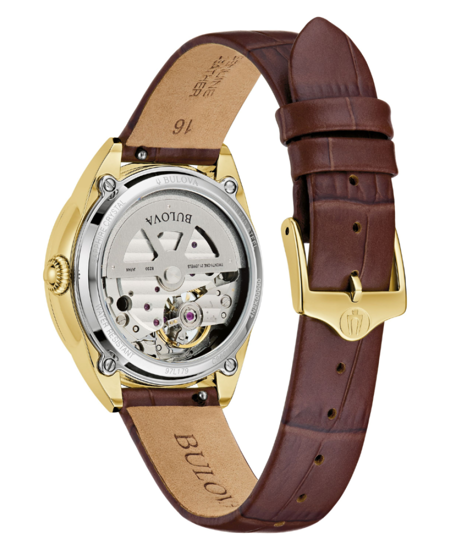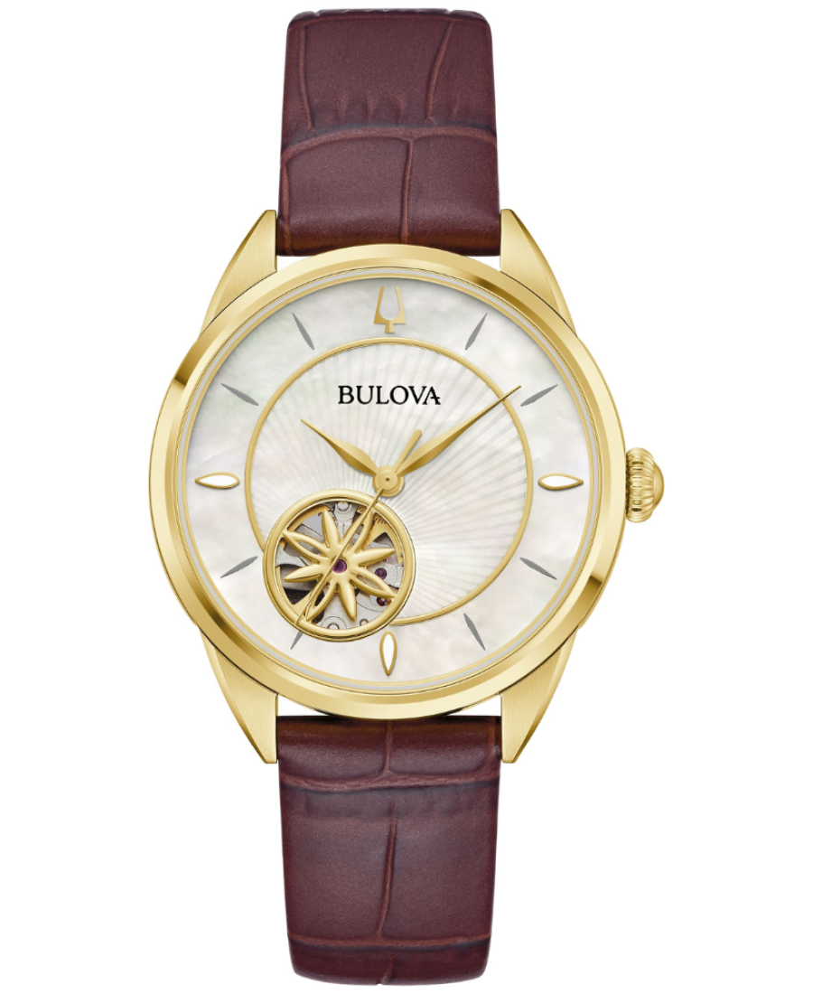 Con un refinamiento inigualable y un diseño atemporal, este reloj Bulova para mujer presenta un nuevo reloj automático de la Colección Sutton que realzará tu estilo. El reloj cuenta con una caja dorada de 34 mm con cristal de zafiro abovedado con revestimiento antirreflectante y se combina con una correa de piel marrón con cierre de hebilla. La brillante esfera de nácar luce un patrón de rayos de sol, índices y agujas dorados, y una abertura floral que revela el corazón del movimiento automático de 21 rubíes, también visible a través de un fondo transparente, con una reserva de marcha de 42 horas.