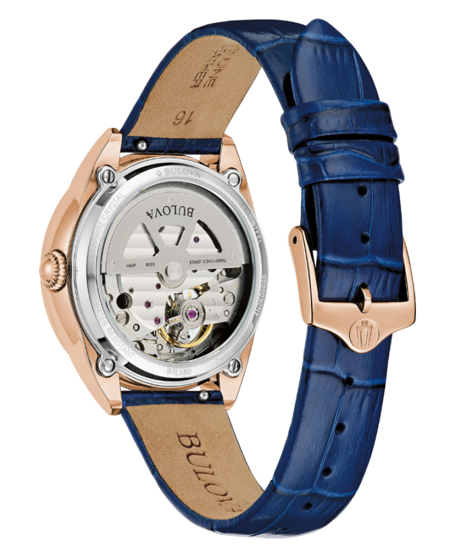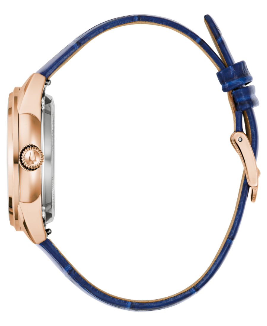 Este reloj Bulova para mujer, de un refinamiento incomparable y un diseño atemporal, presenta un nuevo reloj automático de la colección Sutton que elevará tu estilo. El reloj cuenta con una caja de 34 mm en tono oro rosa con un cristal de zafiro abovedado con revestimiento antirreflejos y está emparejado con una correa de cuero azul marino con cierre de hebilla. La esfera de nácar brillante presenta un patrón de rayos de sol, marcadores de hora y manecillas en tono dorado y una abertura floral que revela el corazón del movimiento automático de 21 joyas, también visible a través de un fondo de caja transparente, que tiene una reserva de marcha de 42 horas.
