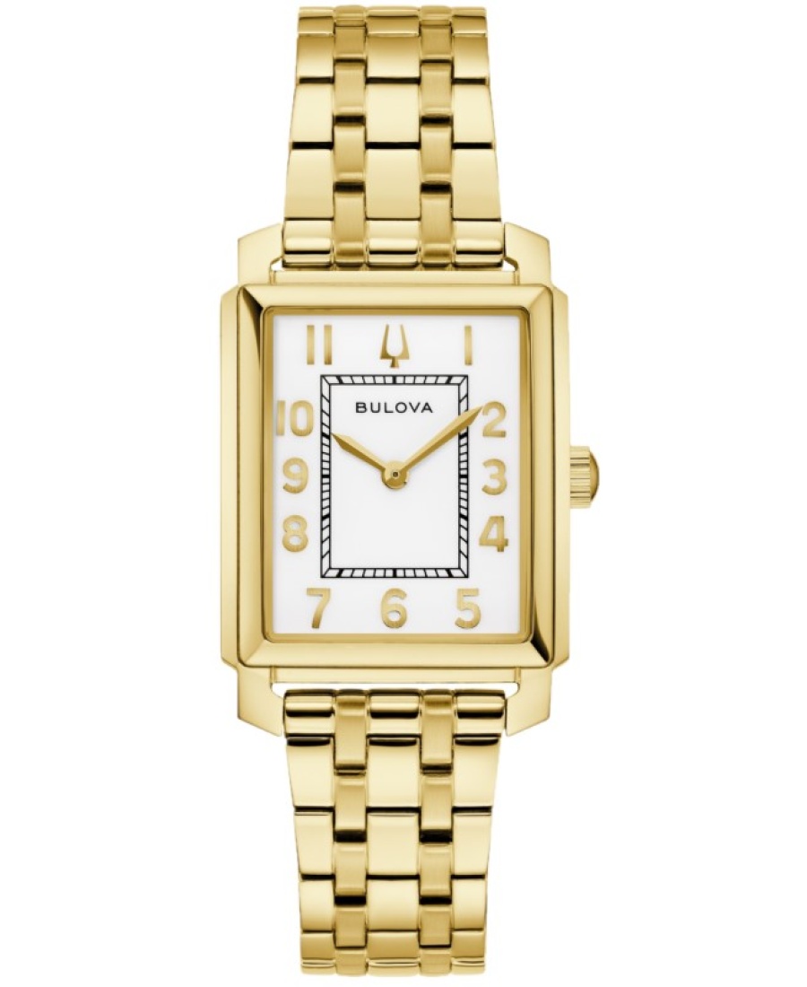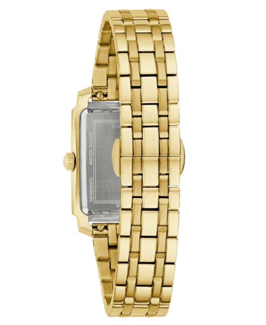 Reloj para Dama colección Sutton. Movimiento de cuarzo de 2 manecillas. Caja cuadrada y brazalete realizados en acero inoxidable oro, broche desplegable de doble pulsador.