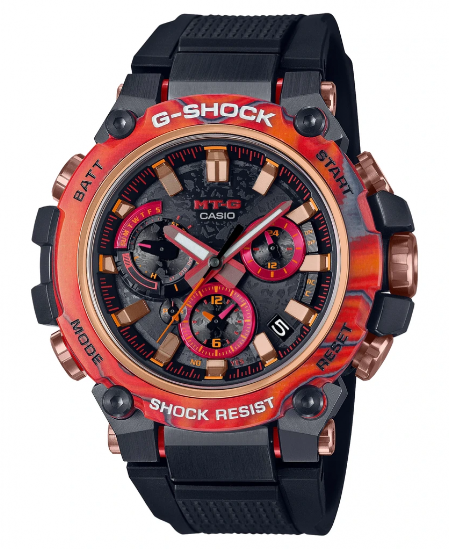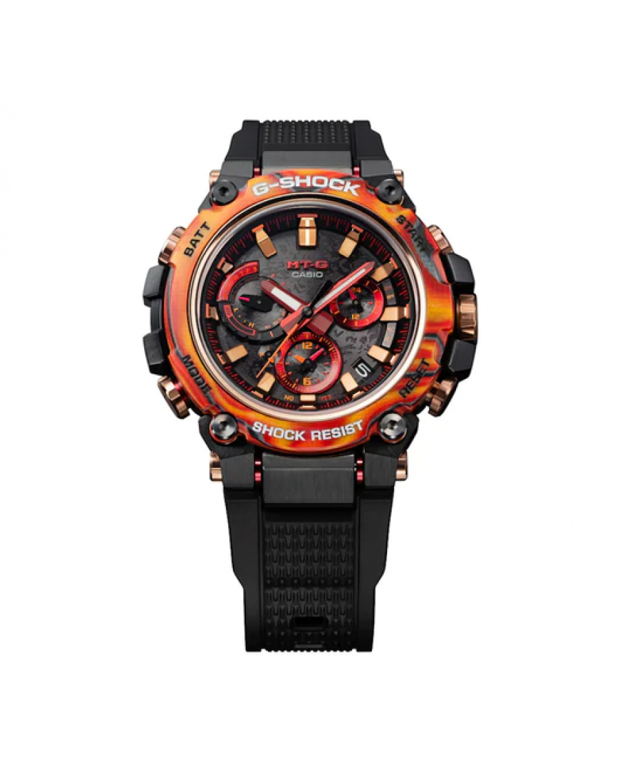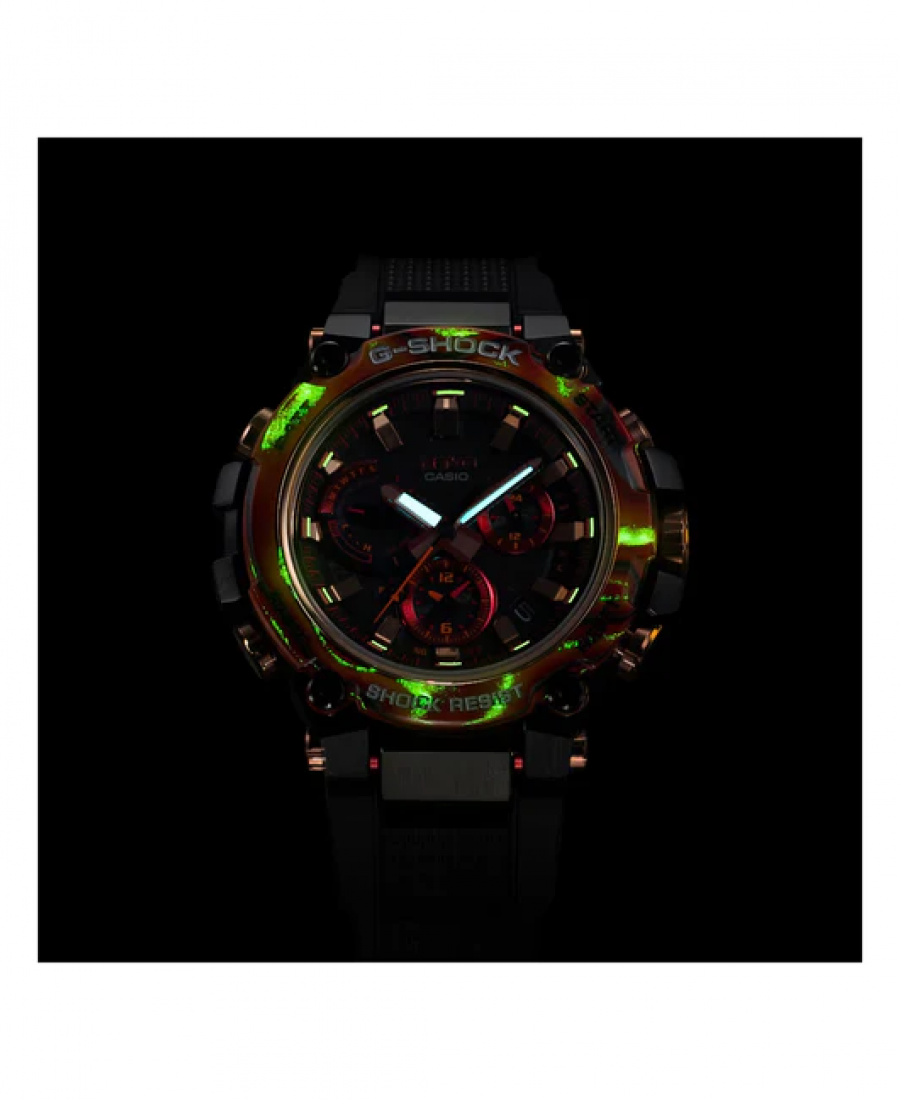 Otras características: Cronometraje regular: Analógico: 3 manecillas (hora, minuto (la manecilla se mueve cada 5 segundos), segundo), 3 diales (horario dual de hora y minutos, horario dual de 24 horas, día)