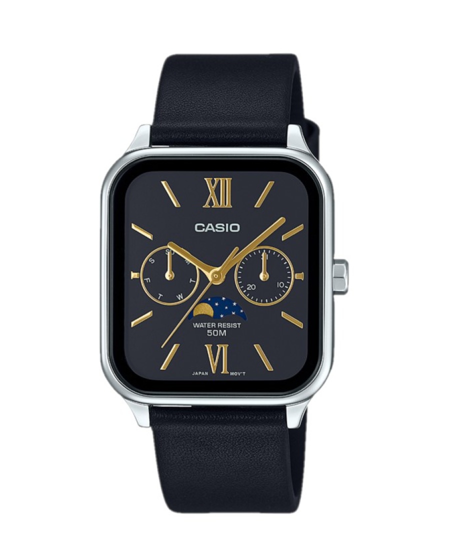 Cronometraje normal: Analógico: 3 manecillas (hora, minutos, segundos), 3 diales (fecha, día, fase lunar)