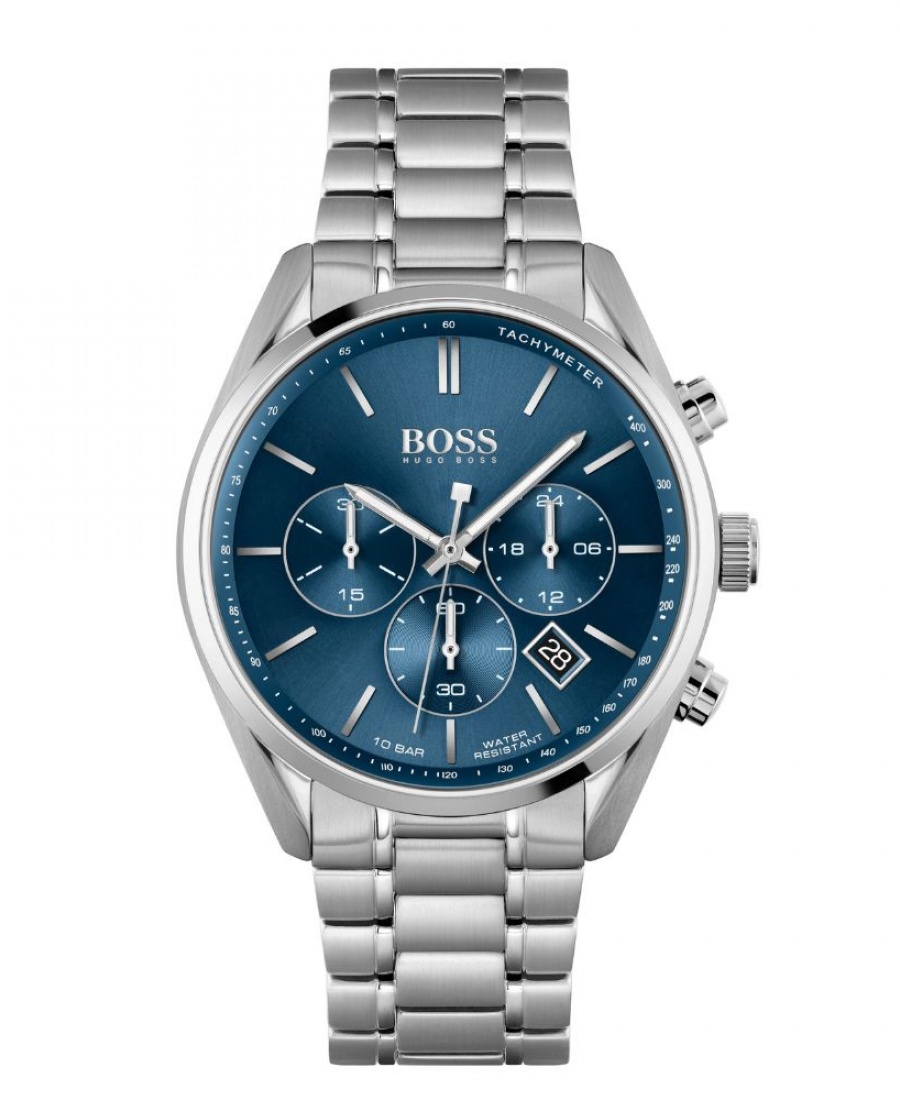 Reloj Hugo Boss para Caballero con malla y caja de acero inoxidable plateado. La esfera cuenta con una funcion de cronografo y taquimentro. Las manecillas son de acero inoxidable plateado combinando así con el fondo de la esfera en tono azul metalizado.