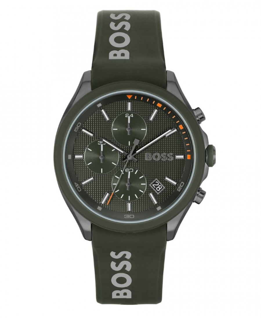 Reloj Hugo Boss para Caballero con una malla de silicona con detalles de la marca, caja de acero inoxidable acompañado de una esfera con funcion de cronografo y una ventana de fecha. Las manecillas son de acero inoxidable.