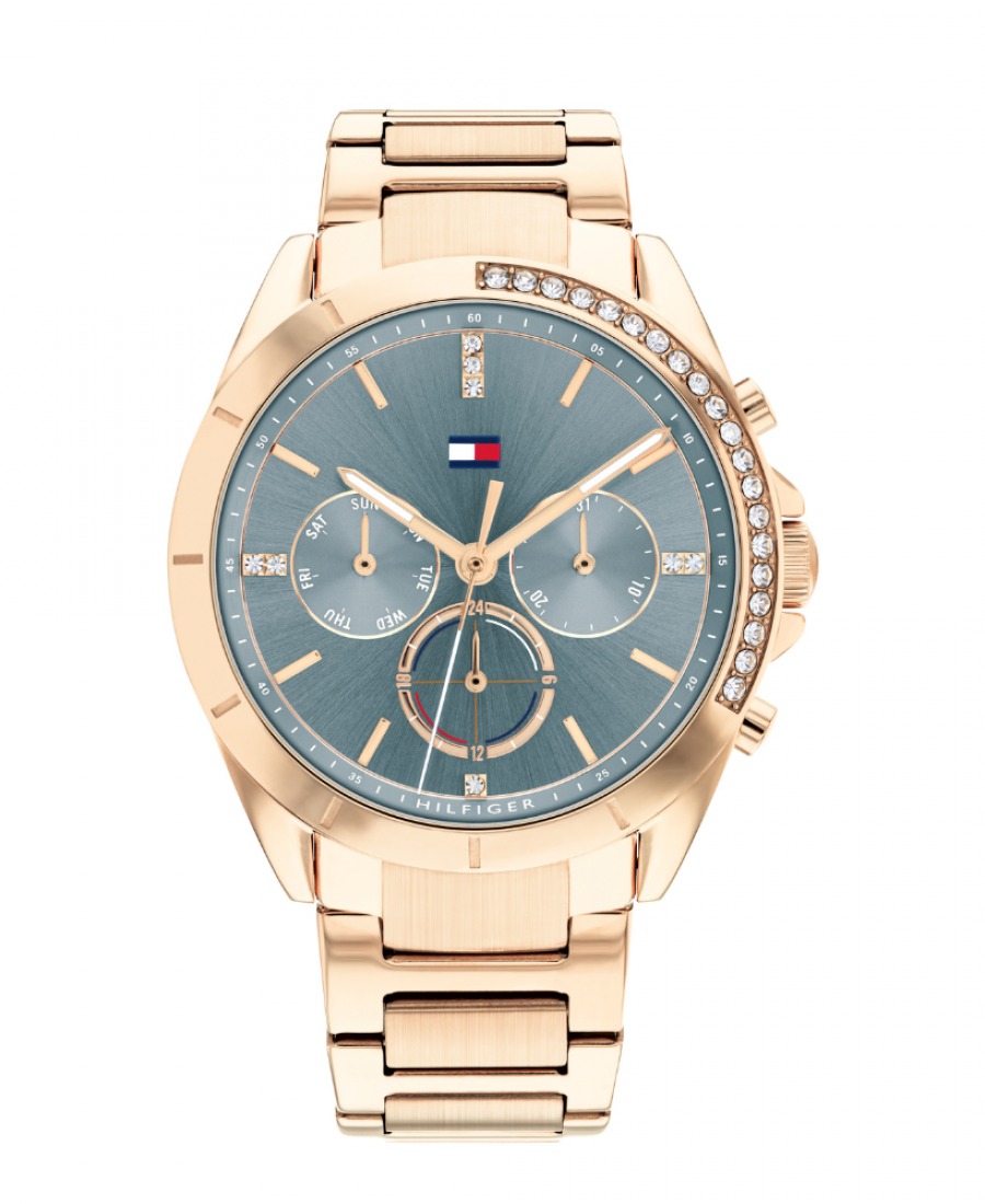 Tommy Hilfiger para mujer es un reloj elegante y perfecto para todos los días. Poco convencional y encantador. Esta colección de bisel con detalle de piedras, tiene una caja de 38 mm que presenta esferas de rayos de sol con elementos de diseño icónicos, protector de corona, sub diales enmarcados e índices de piedra.